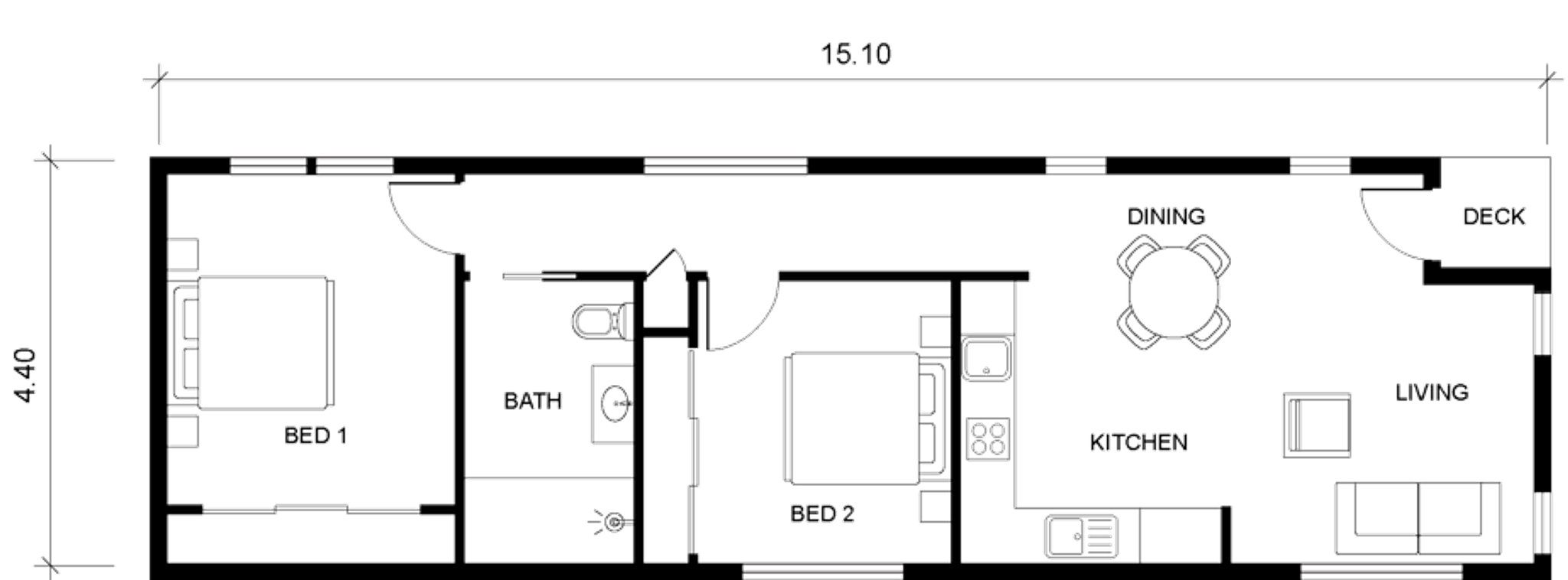 Standard features include an open-plan living and dining zone that connects seamlessly to the outdoor deck, enhancing airflow and everyday usability. Both bedrooms are well-sized and positioned for privacy, ensuring comfort throughout the home. Built with Saltair’s durable and energy-efficient modular construction system, the Keppel 211 provides long-lasting performance and full compliance with NCC and council requirements.