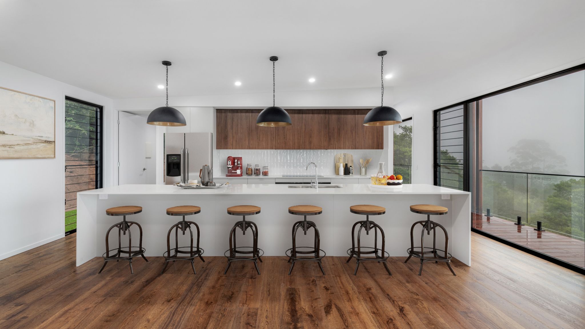 Saltair’s expertise in designing for complex sites made this project possible. The home features an angled layout, carefully designed to follow the shape of the block and maximise the stunning views. To achieve this, several modules were designed in triangular shapes - departing from the usual rectangular format - allowing the home to seamlessly hug the landscape. Despite the difficult access, the Saltair team worked closely with the crane company to ensure a smooth and efficient installation. The final result? A breathtaking, light-filled home with a spacious kitchen, a walk-in pantry with abundant storage, a luxurious walk-in robe, and thoughtfully placed windows, including fixed and louvred options, to enhance views and airflow. The clients are absolutely thrilled with their home, proving once again that modular can achieve the extraordinary, even in the clouds.